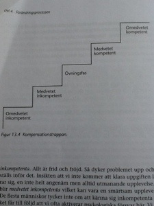Bo Ahrenfelt har skrivit boken Förändring som tillstånd och i den beskriver han att inför nya uppgifter och problem hamnar vi i situationer vi inte vet hur vi ska lösa. Detta beskriver han genom kompensationstrappan. Vi börjar som omedvetet inkompetenta, innan vi inte ens vet att problemet eller uppgiften finns. Då är allt frid och fröjd. Så dyker problemet upp. Insikten gör oss medvetet inkompetenta vilket kan vara en smärtsam upplevelse och här sätter våra försvar in. Därefter går vi in i övningsfasen och övning ger faktiskt färdighet. Det är här jag tror att vi inte kliver över i övningsfältet utan blir stående i medvetet inkompetena och pratar om och hur och varför och… Har man väl klivit in i övningsfältet finns ytterligare ett motstånd inbyggt. Nämligen att det inte går så bra som man har tänkt sig, på en gång…Det krävs nämligen inte bara övning utan också tillräckligt med övning. När ny färdighet har tillägnats blir vi medvetet kompetenta. Ahrenfelt beskriver ytterligare ett slutgiltigt steg och det är omedvetet kompetent. Det är när färdigheten blir tyst kunskap, sådant vi har i ryggmärgen och tar förgivet, som att cykla och gå.