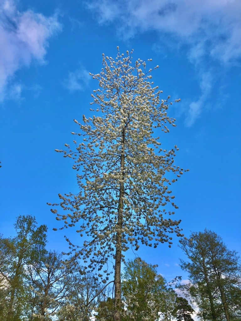 Mot en pelare av vita körsbärsblommor.