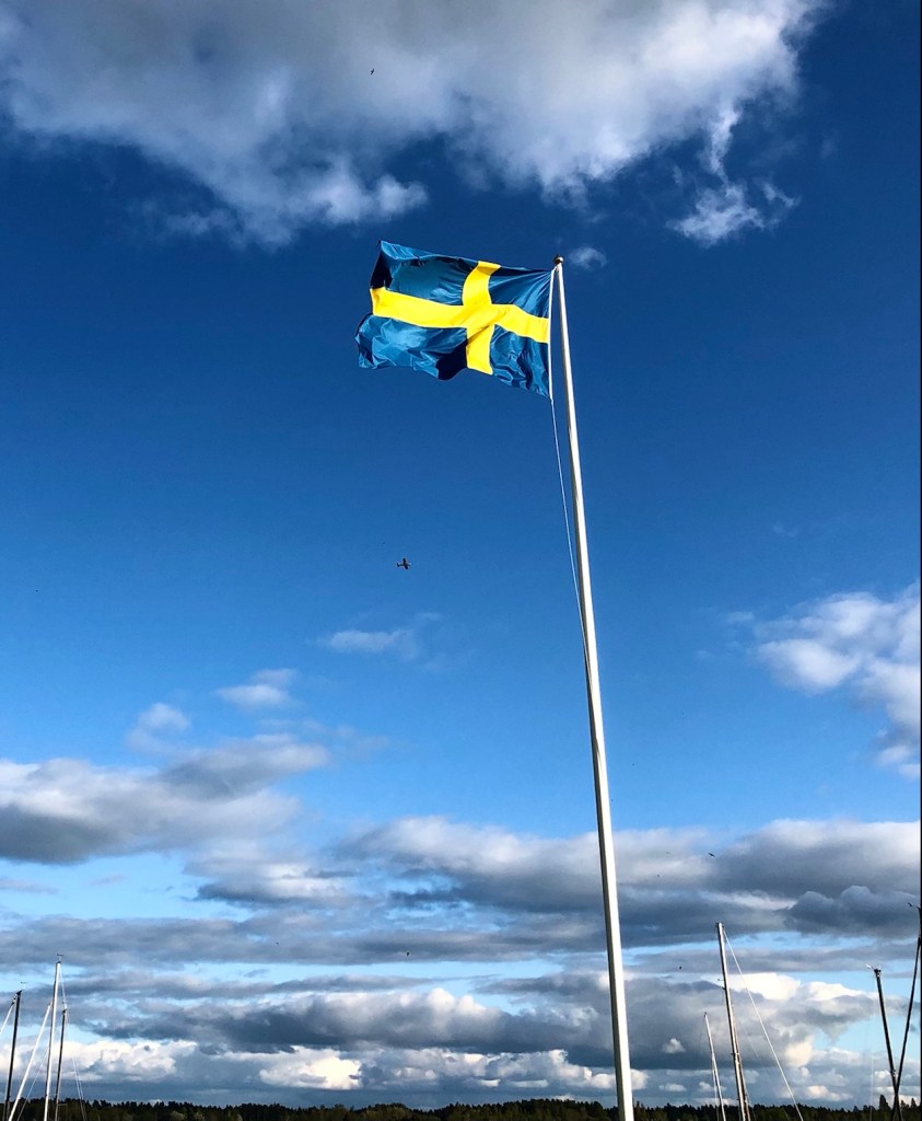 Mot flaggan som slår i vinden.
